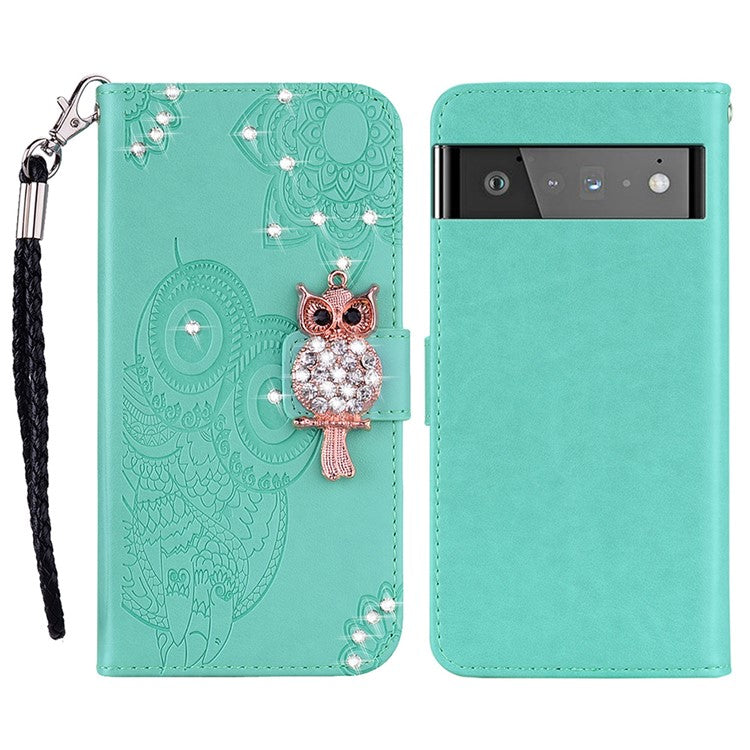 Bling Rhinestone Decor Imprinted Owl Flower Pattern Leather Case Shell with Stand Wallet for Google Pixel 6 - Cyan