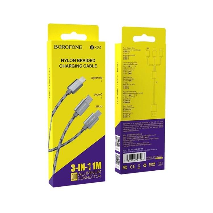 Borofone BX24 Ring Current USB-C / Type-C + 8 Pin + Micro USB to USB Weave Charging Data Cable for iPhone, iPad, Galaxy, Huawei, Xiaomi, HTC, Sony and Other Smartphones (Grey)