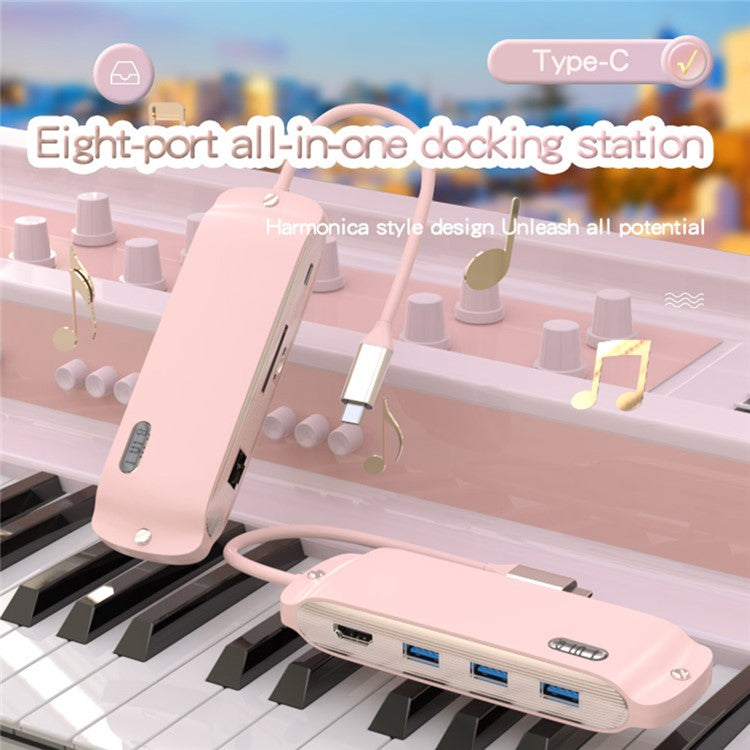 BS8H Type-C Hub Converter to PD+USB 3.0+2xUSB 2.0+HD Video Output Port+2 Card Reader Slots+RJ45 - Pink