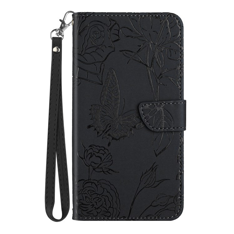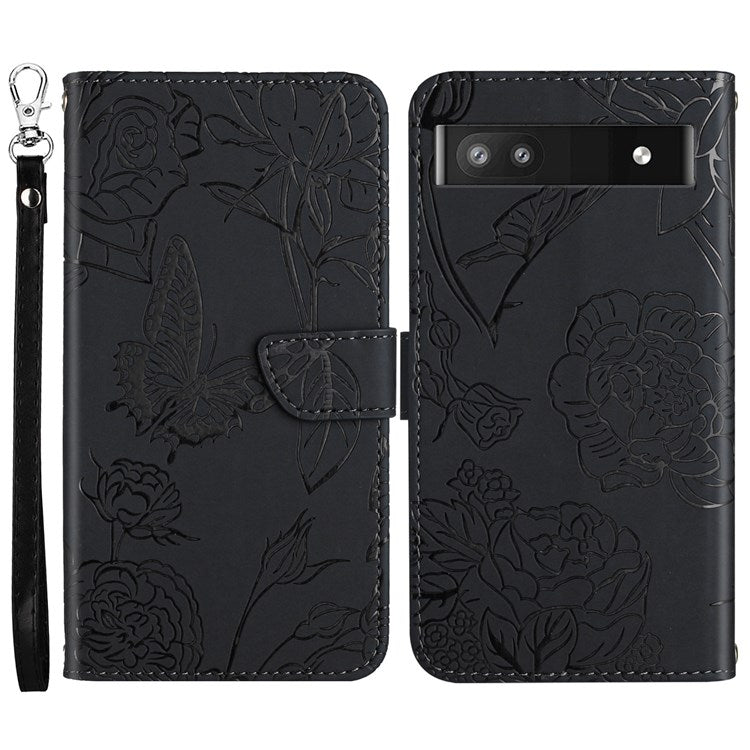 Butterfly Flowers Imprinting Fingerprint Free PU Leather Phone Shell for Google Pixel 6a, Pattern Imprinting Design Wallet Stand Case with Handy Strap - Black