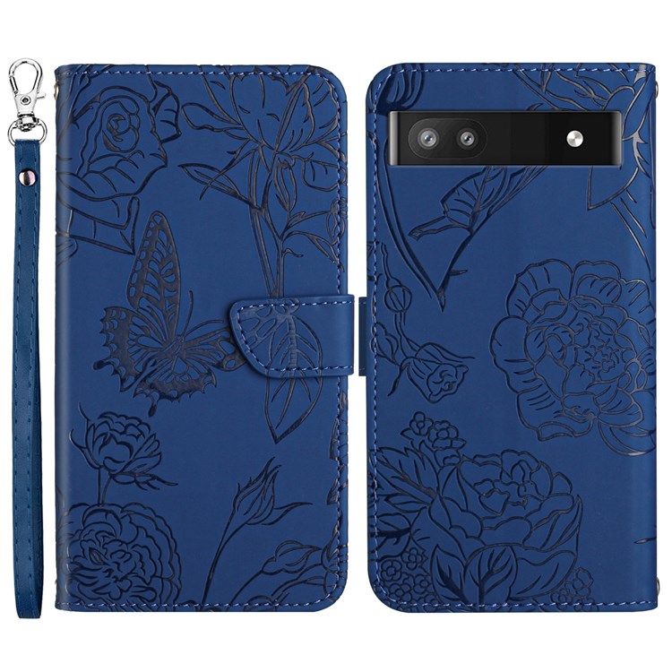 Butterfly Flowers Imprinting Fingerprint Free PU Leather Phone Shell for Google Pixel 6a, Pattern Imprinting Design Wallet Stand Case with Handy Strap - Blue