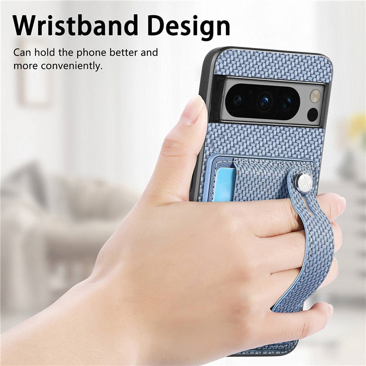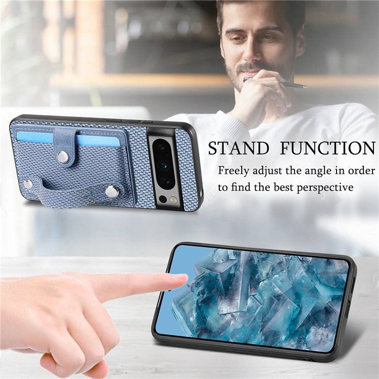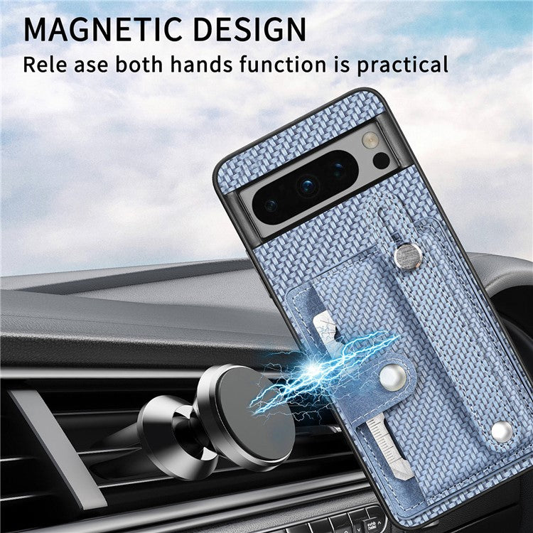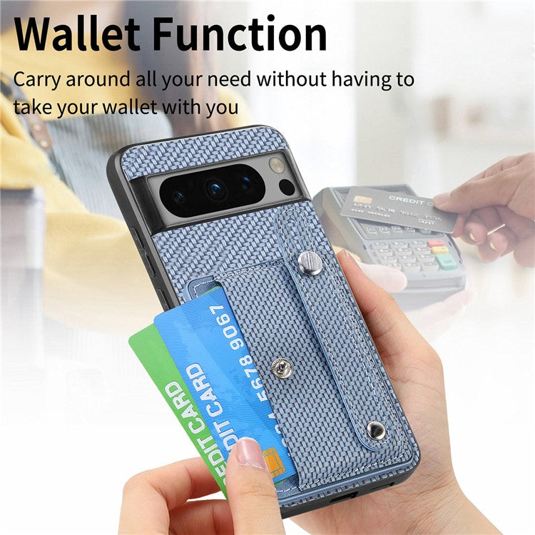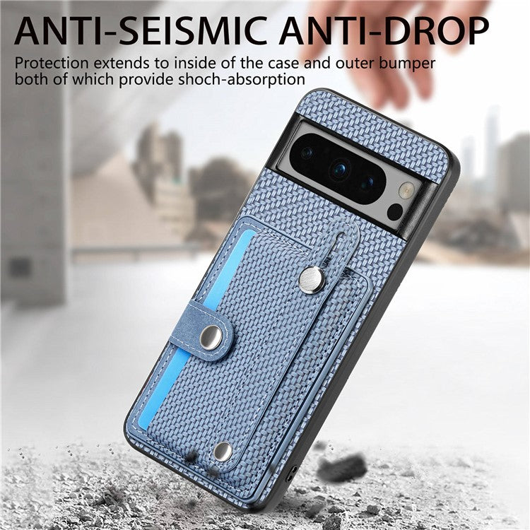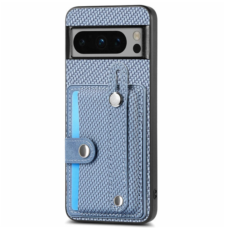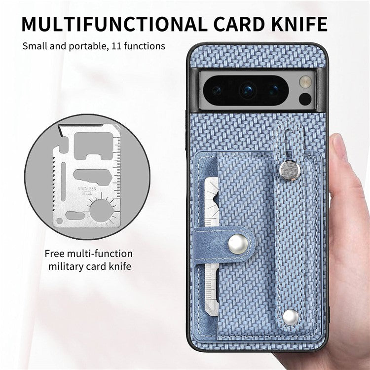 C1-01 For Google Pixel 8 Pro Case Card Holder Leather Back Cover Wristband Card Knife Tool - Blue