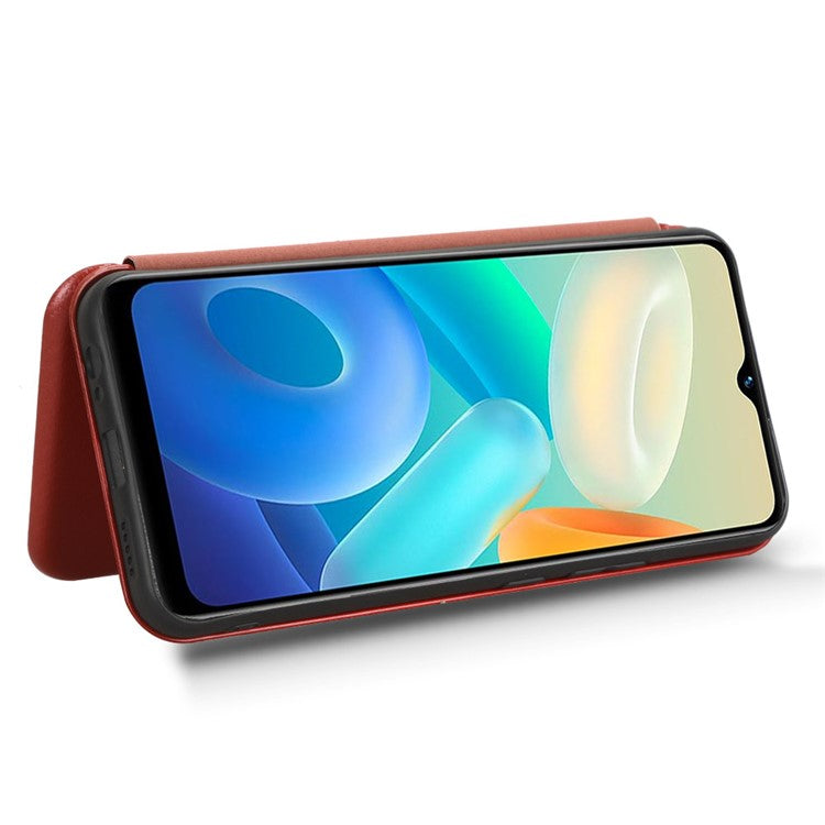 Carbon Fiber Texture Leather Case for vivo Y02s 4G , Stand Card Holder Phone Cover - Brown