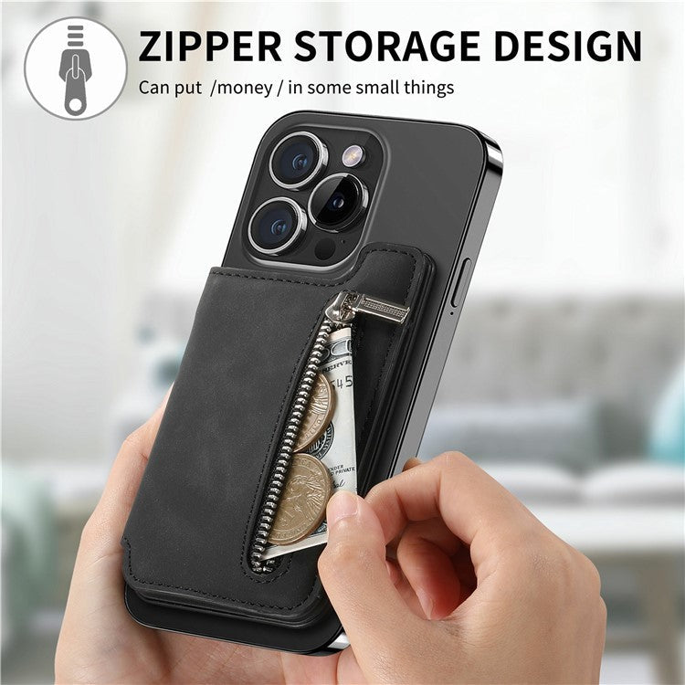 Card Holder Compatible with MagSafe Kickstand Leather Zipper Card Bag RFID Blocking - Black