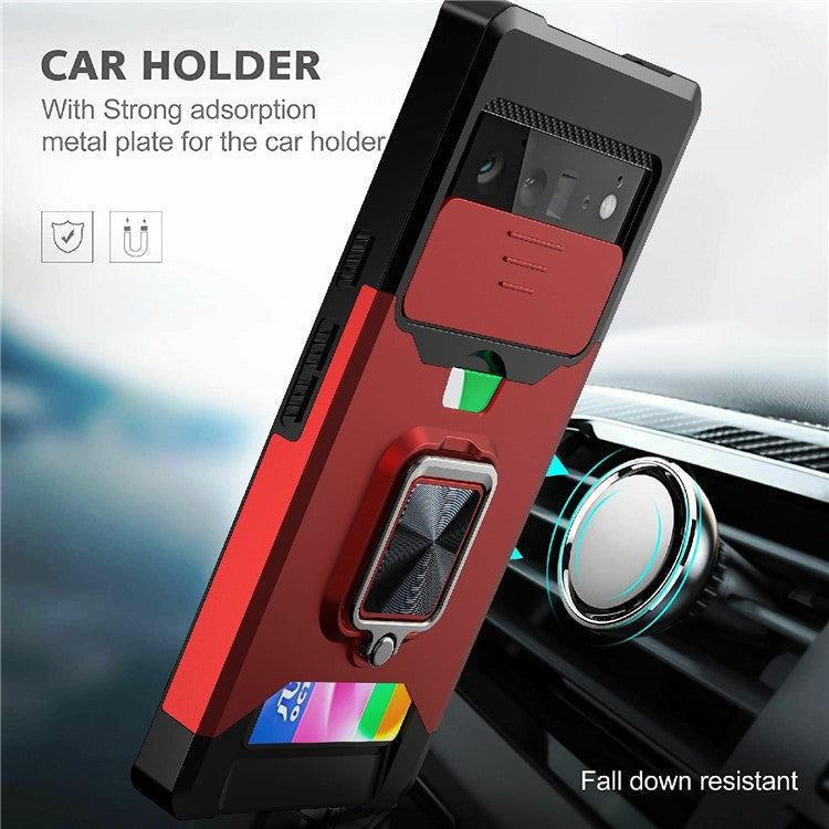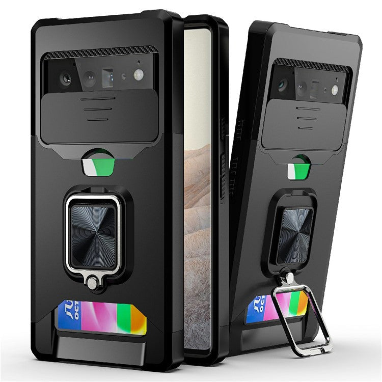 Card Slot Kickstand PC + TPU Hybrid Case Camera Slide Protector Phone Shell for Google Pixel 6 Pro - Black