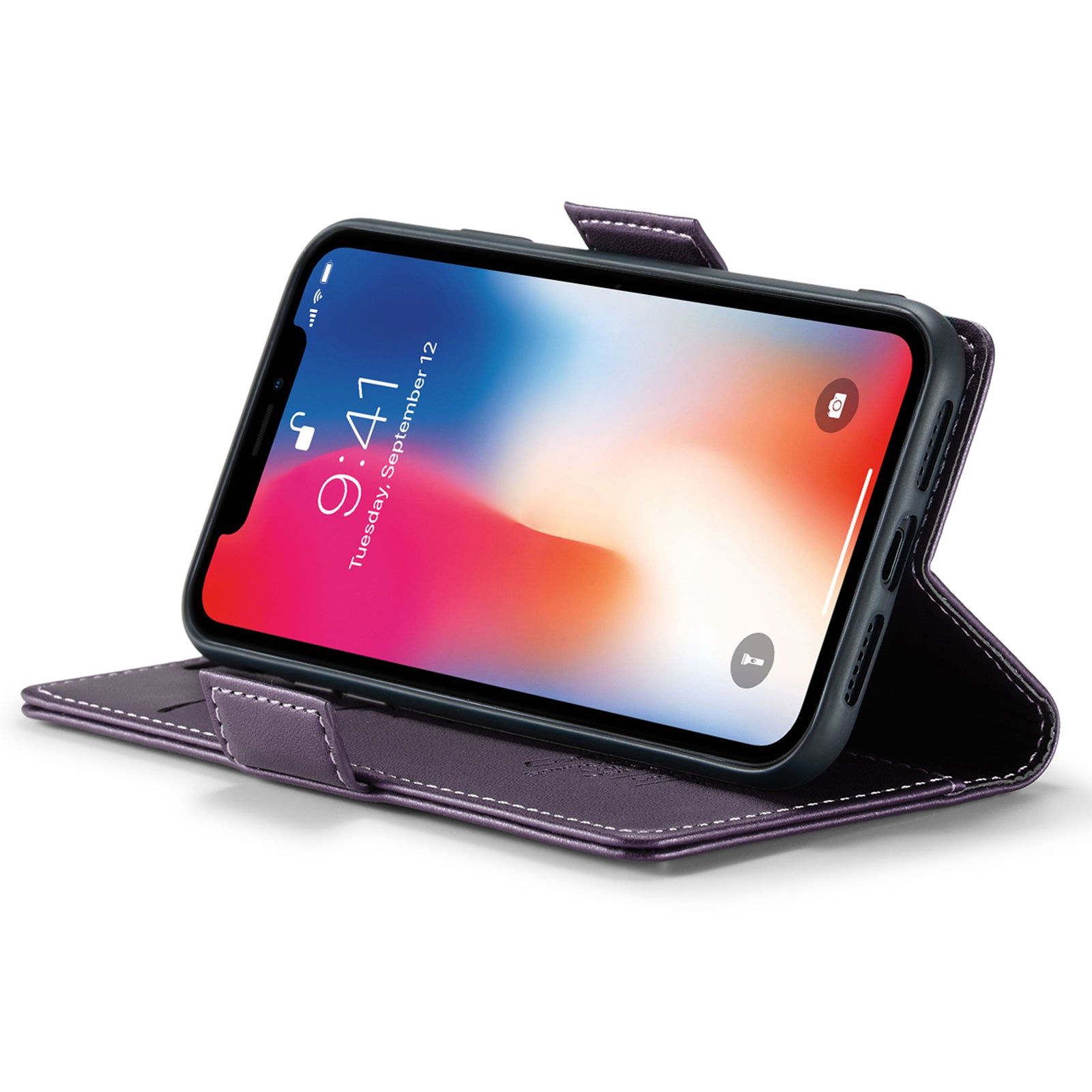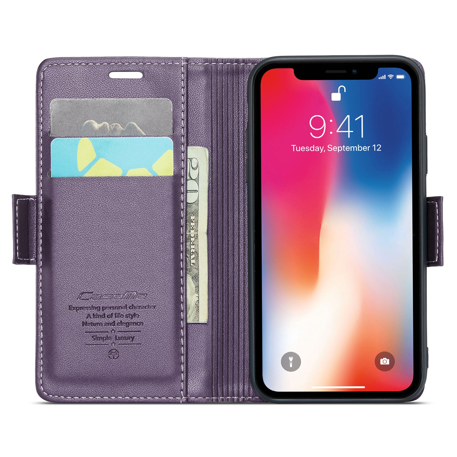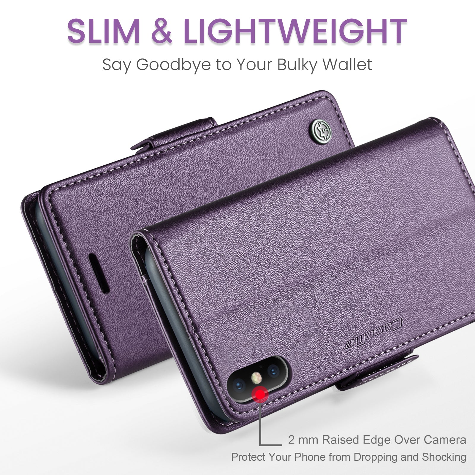 Caseme RFID Blocking Leather Case for iPhone XS , Litchi Texture Stand Wallet Phone Cover - Purple
