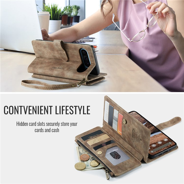 CASEME C30 Series for Google Pixel 9 Pro XL Case Leather Phone Cover with 10 Card Holder Zipper Pocket - Brown