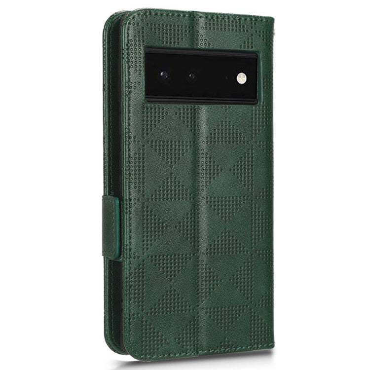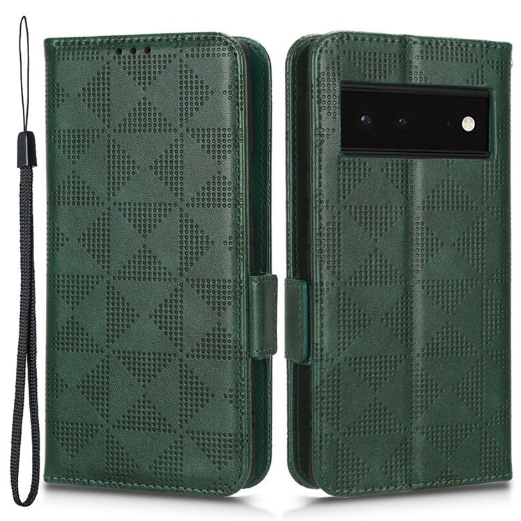 Cell Phone Case for Google Pixel 6, Imprinted Triangle Stand Anti-scratch Wallet PU Leather Cover with Strap - Green