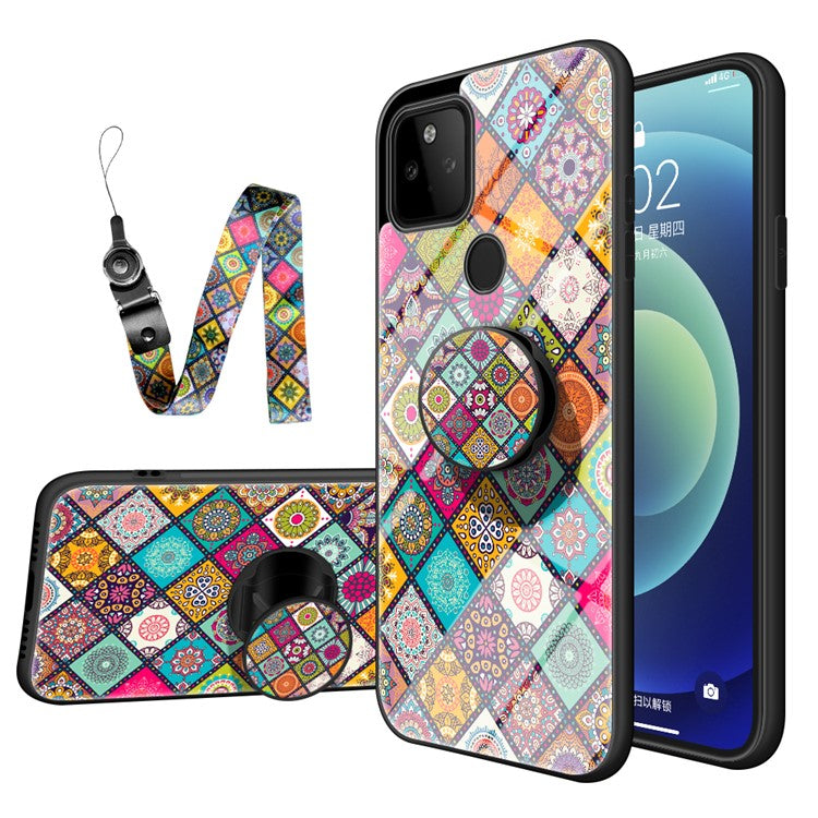 Colorful Flower Printing Design Hybrid Glass Case Phone Protector with Lanyard for Google Pixel 5a 5G - Checkered Pattern