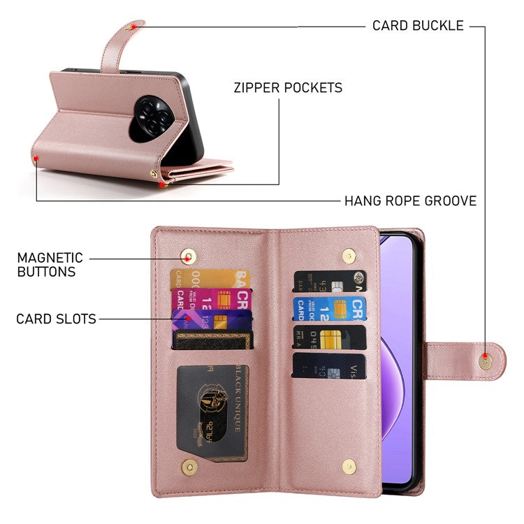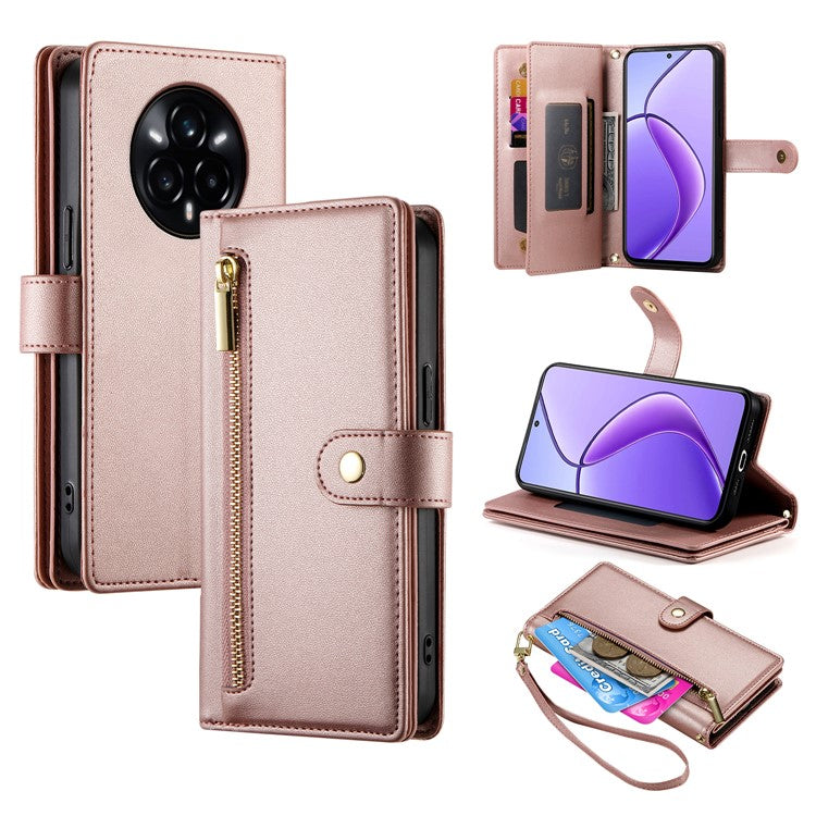 DF-011 For Realme 14 Pro+ 5G Case Zipper Pocket Wallet Leather Phone Cover with Straps - Pink