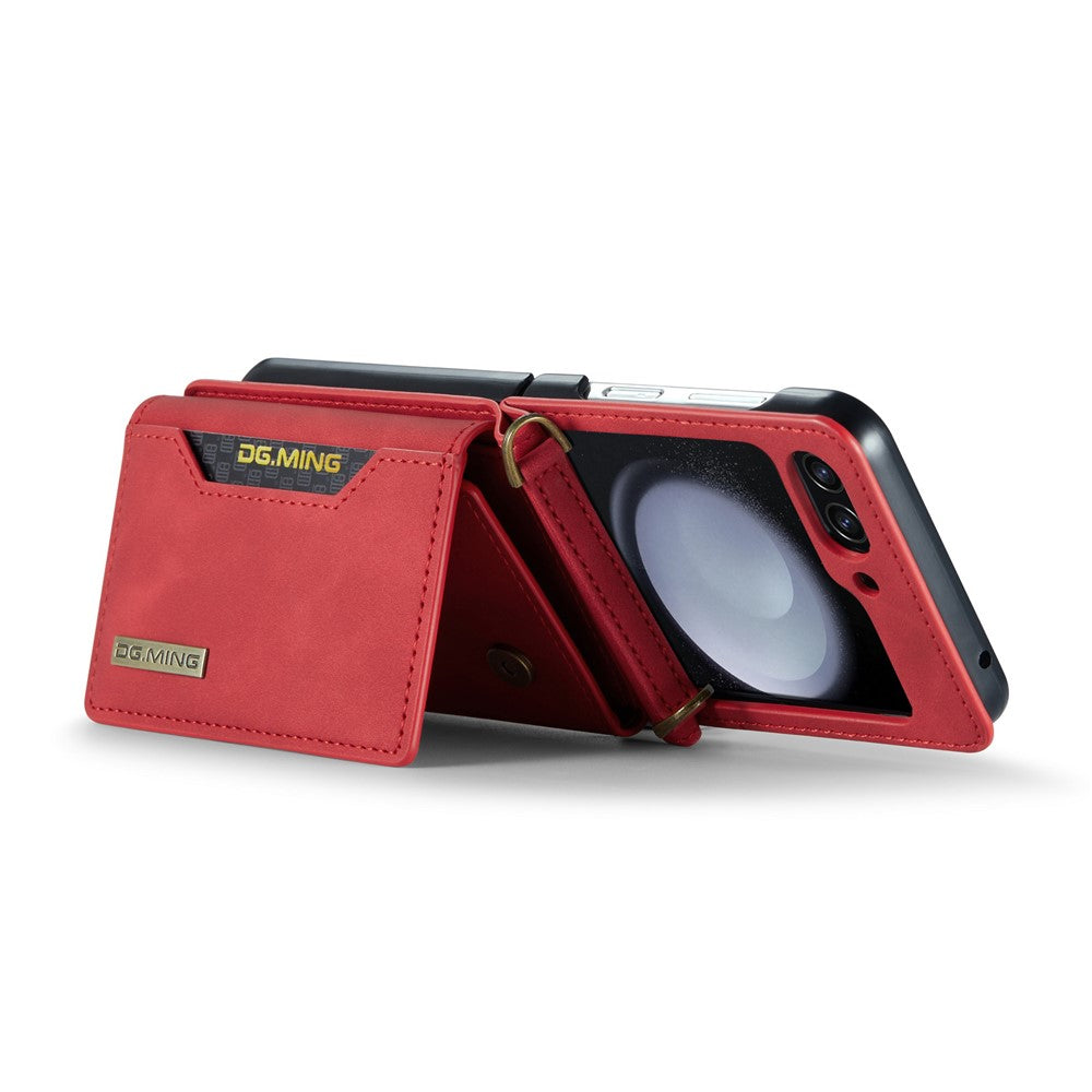 DG.MING M2 Series for Samsung Galaxy Z Flip7 FE 5G / Z Flip6 5G Case PU+PC Phone Cover with Wallet, Strap - Red