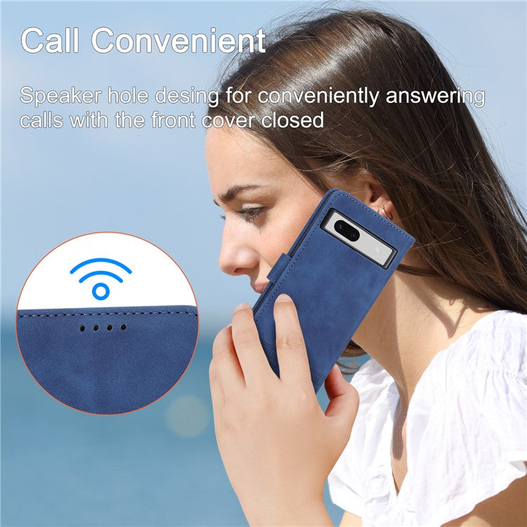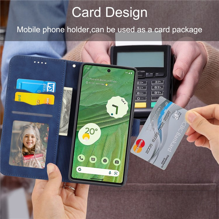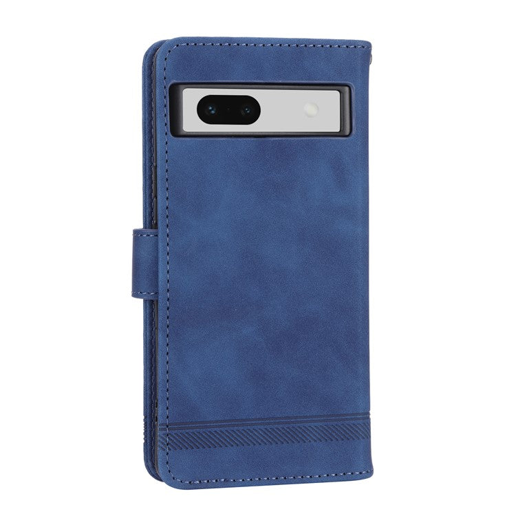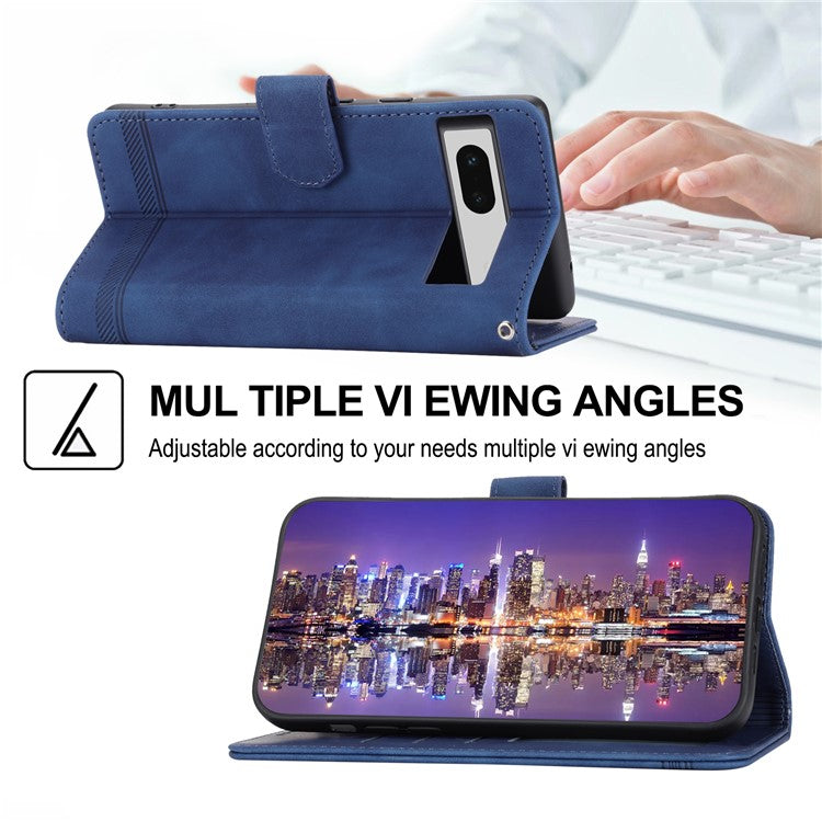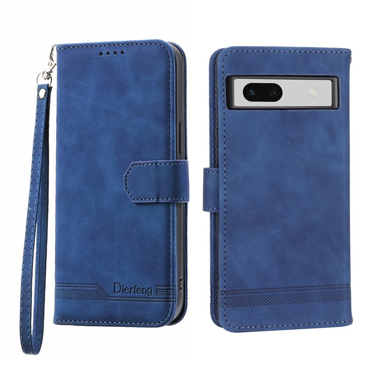 DIERFENG DF-03 PU Leather Wallet Case for Google Pixel 7a, Lines Imprinted Cell Phone Stand Cover - Blue