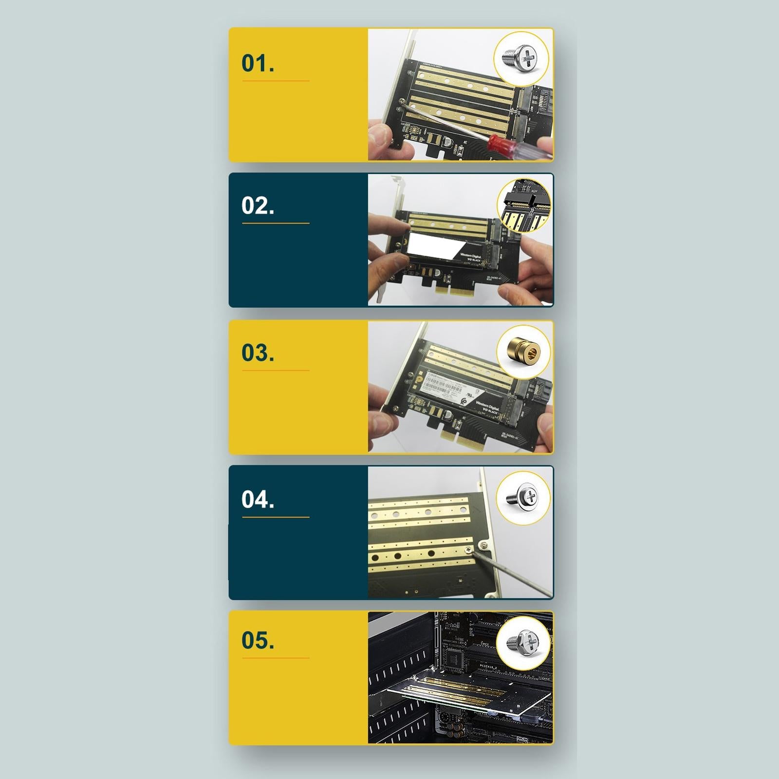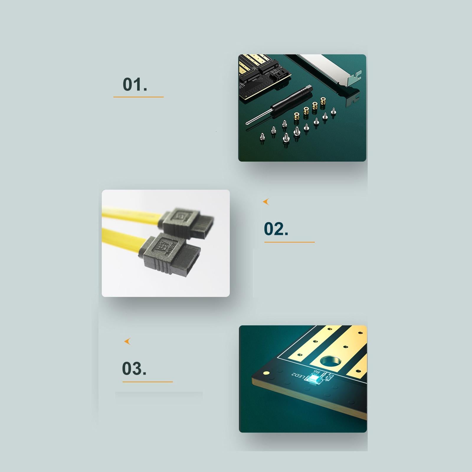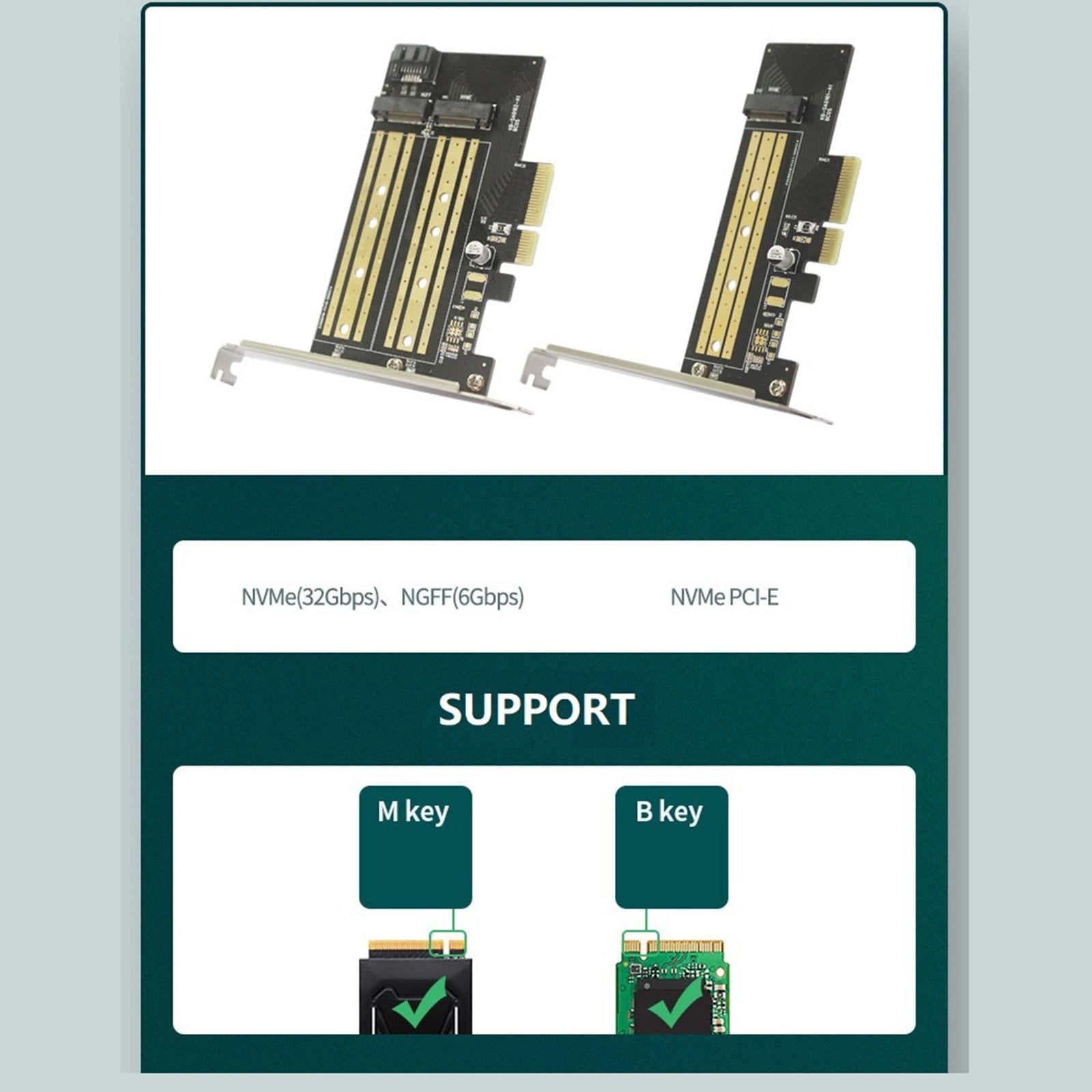 Dual M.2 PCIE Adapter: M.2 NVME SSD(Key M) to PCIe 3.0 x4 interface (32Gbps speed at Max); M.2 SATA-based SSD (Key-B / B + M) to SATA III (SATA cable included)(6Gbps speed at Max).