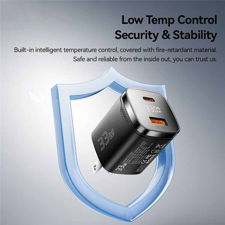 ESSAGER 33W Fast Charging Digital Display USB A + Type C Dual Port GaN Travel Charger - US Plug / White