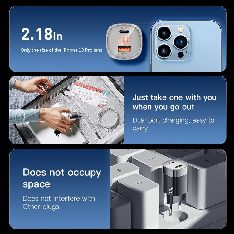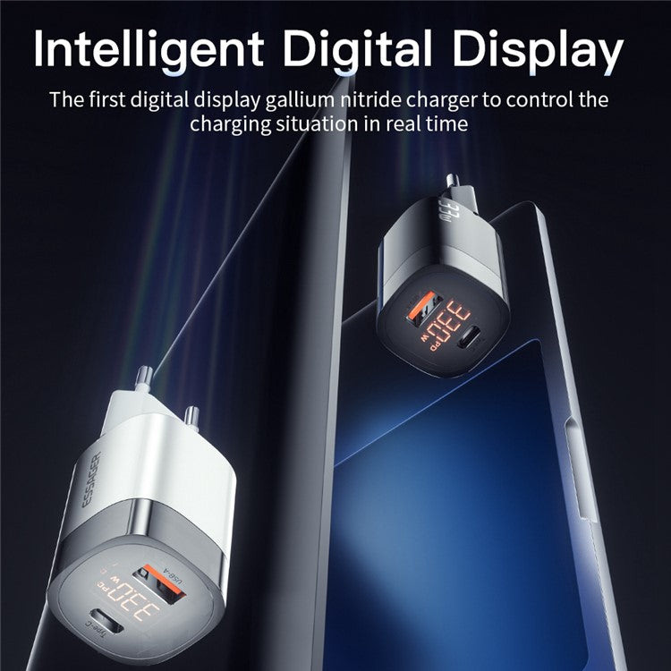 ESSAGER 33W Fast Charging GaN Power Adapter USB-A + Type-C Dual Port Charger with Digital Display - EU Plug / White