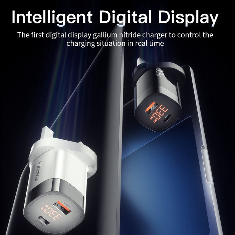 ESSAGER 33W Fast Charging GaN Power Adapter USB-A + Type-C Dual Port Charger with Digital Display - UK Plug / White