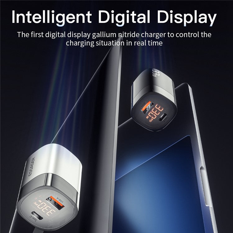 ESSAGER 33W Fast Charging GaN Power Adapter USB-A + Type-C Dual Port Charger with Digital Display - US Plug / White