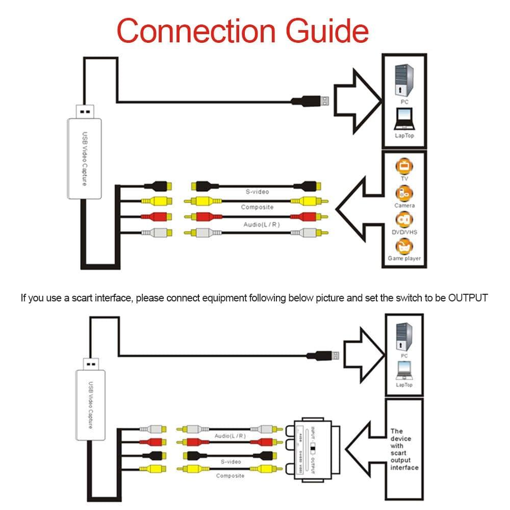 Note 1: You maybe have to buy Video and Audio cable, and S-Video cable to connect the USB Video Capture with your analog video device. You need to buy the Scart Video/Audio adapter if the output of your video source device is Scart type.