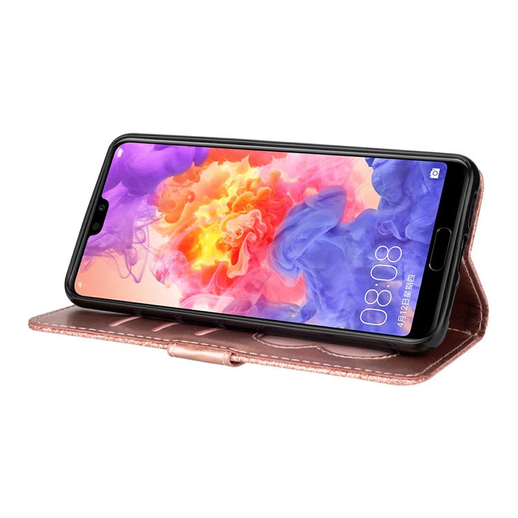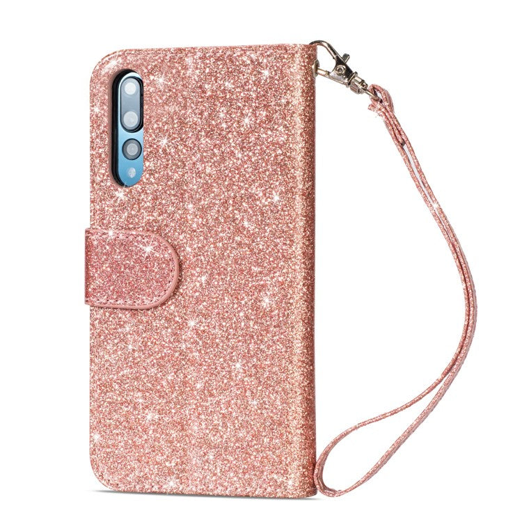 Flash Powder Zippered Stand Leather Wallet Casing with Strap for Huawei P20 Pro - Rose Gold
