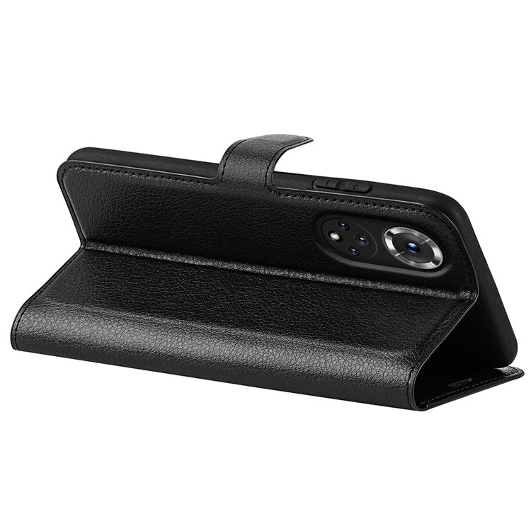 Folio Flip Full Protective Litchi Skin Leather Wallet Phone Stand Case Cover for Honor 50 - Black