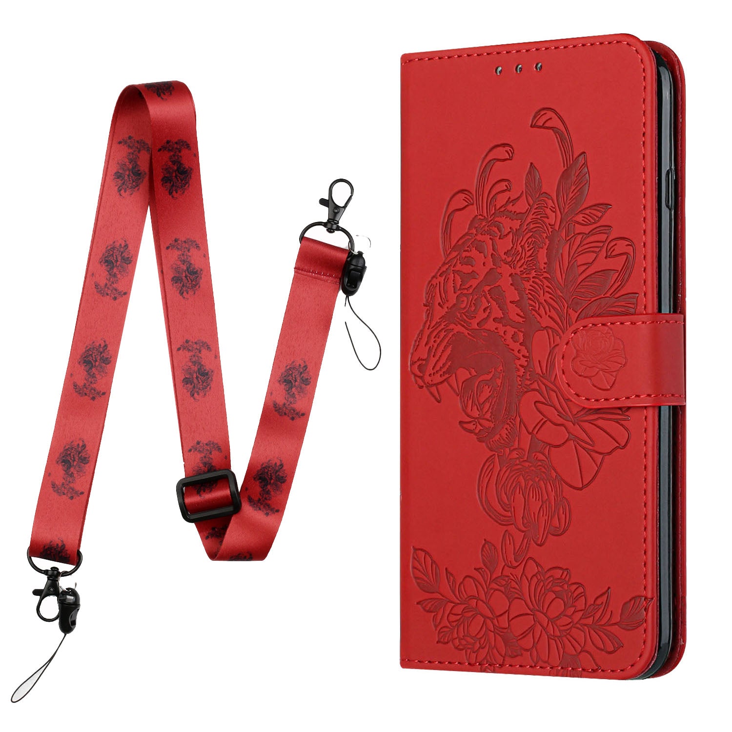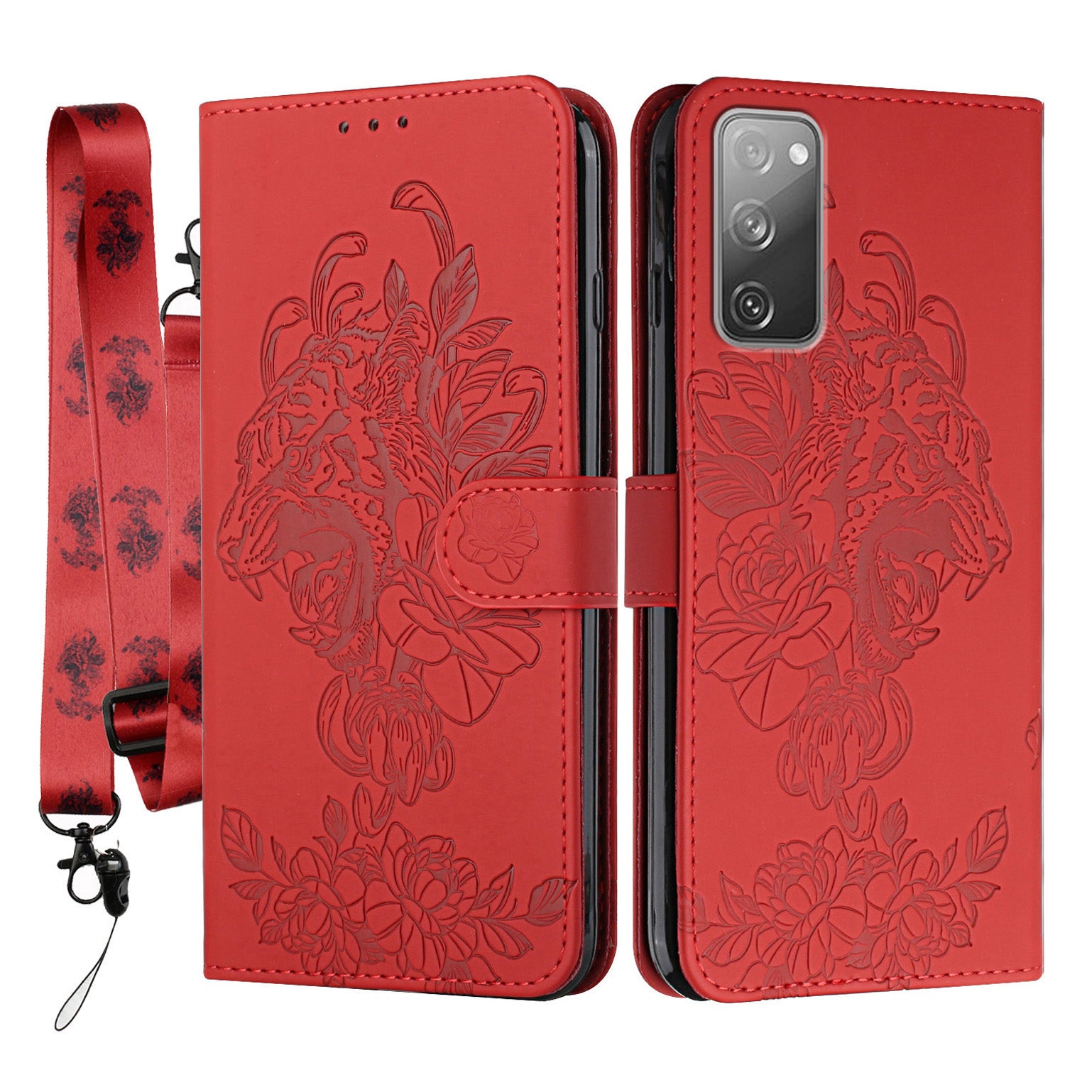 Folio Flip Leather Wallet Stand Cell Phone Case Matching Lanyard with Tiger Head Imprinting for Samsung Galaxy S20 FE 2022/S20 FE 4G/S20 FE 5G/S20 Lite - Red
