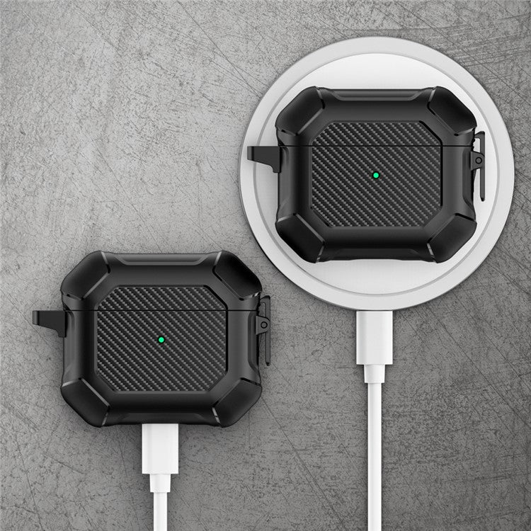 For AirPods 3 Earphone Protective Cover TPU+PC Carbon Fiber Texture Shockproof Case with Carabiner - Grey