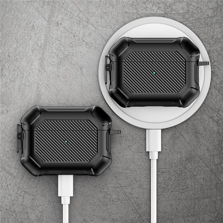 For AirPods Pro 2 TPU+PC Earphone Case Carbon Fiber Texture Reinforced Protective Cover with Carabiner - Purple