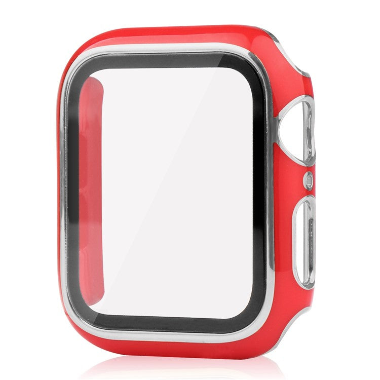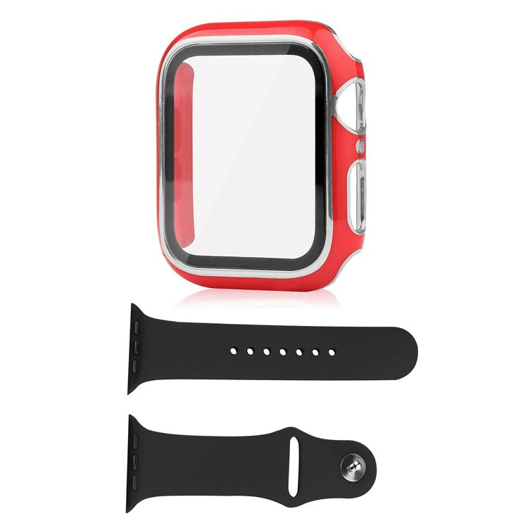 For Apple Watch SE (2022) 44mm / SE 44mm / 6 / 5 / 4 44mm Silicone Watch Band + PC Watch Case with Tempered Glass Screen Protector Electroplating Protective Case Cover - Red / Silver