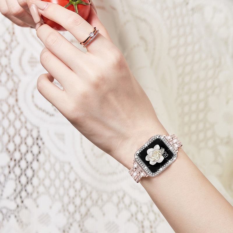 For Apple Watch Series 1 / 2 / 3 38mm Rhinestone Decor Stainless Steel Smart Watch Band with Hollow-out PC Watch Case - Pink / Gold