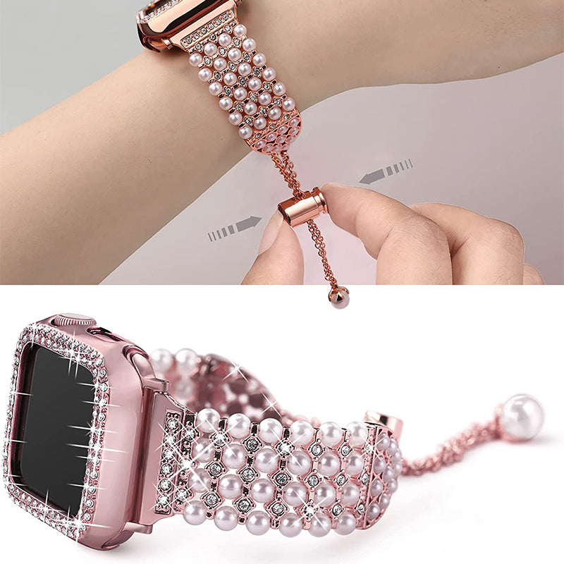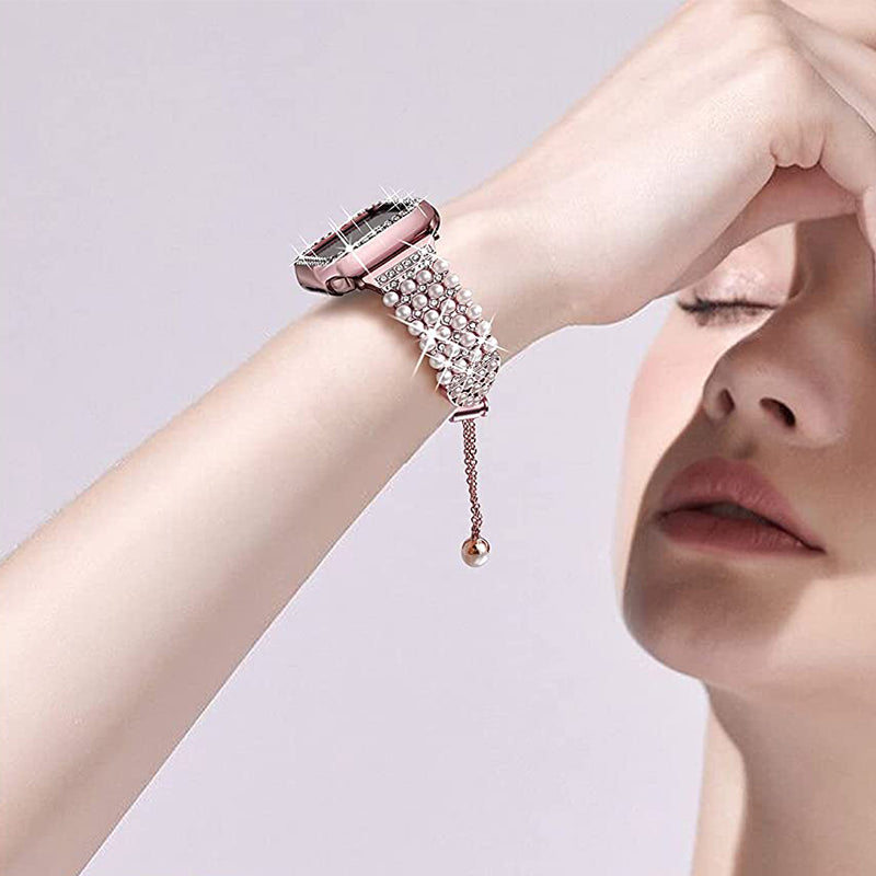 - Shiny rhinestones and faux pearls decor make this watch band delicate and chic