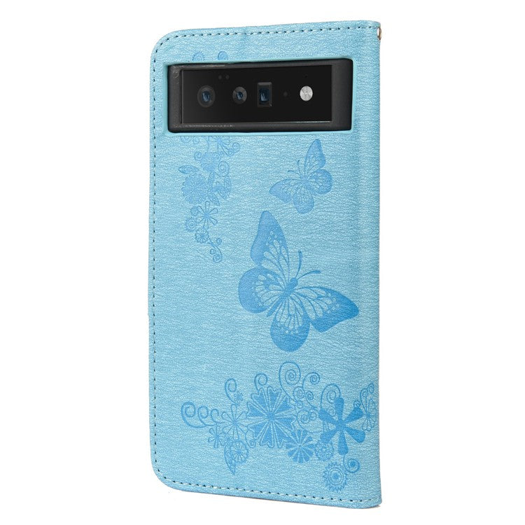 For Google Pixel 6 Pro Imprinted Butterflies Flower Leather Case Wallet Stand Phone Cover Shell - Blue