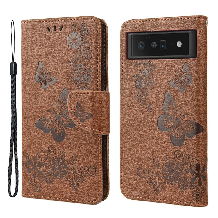 For Google Pixel 6 Pro Imprinted Butterflies Flower Leather Case Wallet Stand Phone Cover Shell - Brown