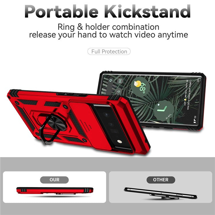 For Google Pixel 6 Pro Shockproof Phone Protection Case Ring Kickstand Hybrid PC + TPU Shell with Slide Camera Protection Cover - Red