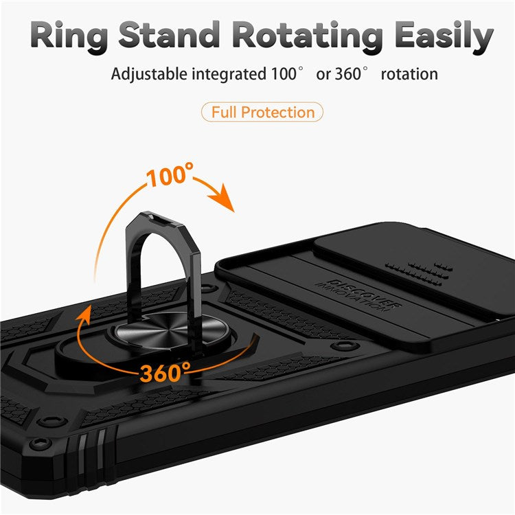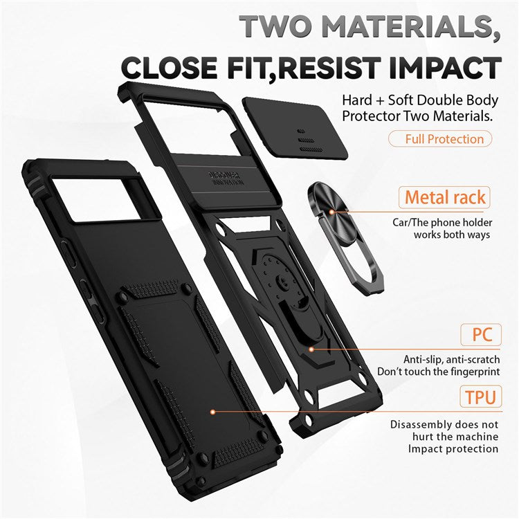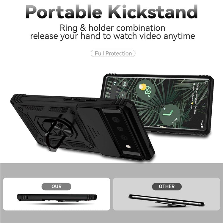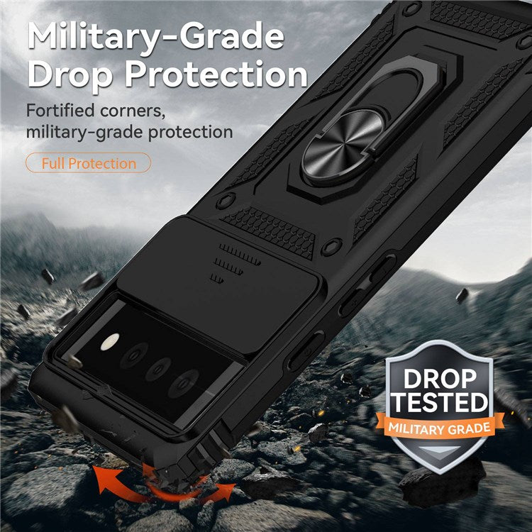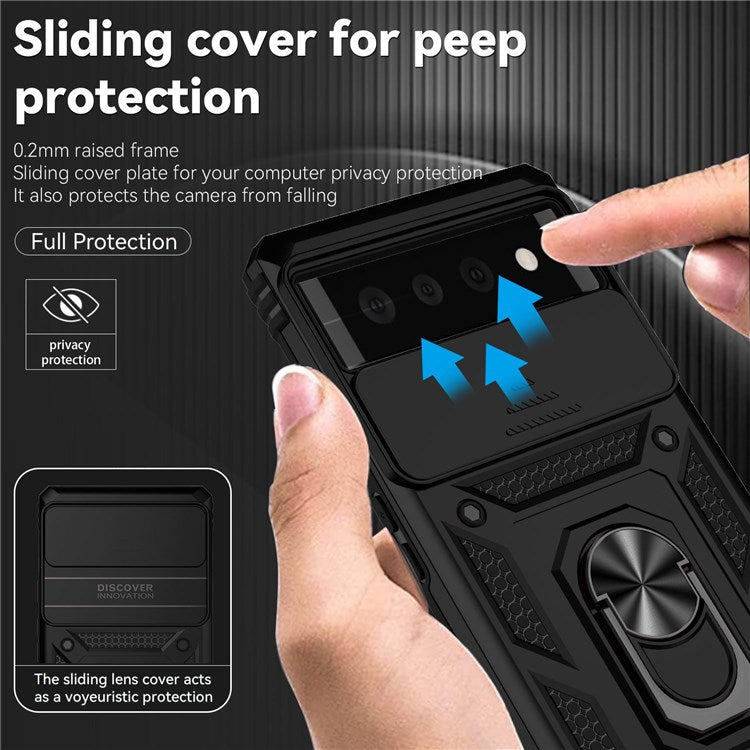 For Google Pixel 6 Ring Holder Metal Kickstand Phone Case Hard PC + TPU Shell with Slide Camera Protection Cover - Black
