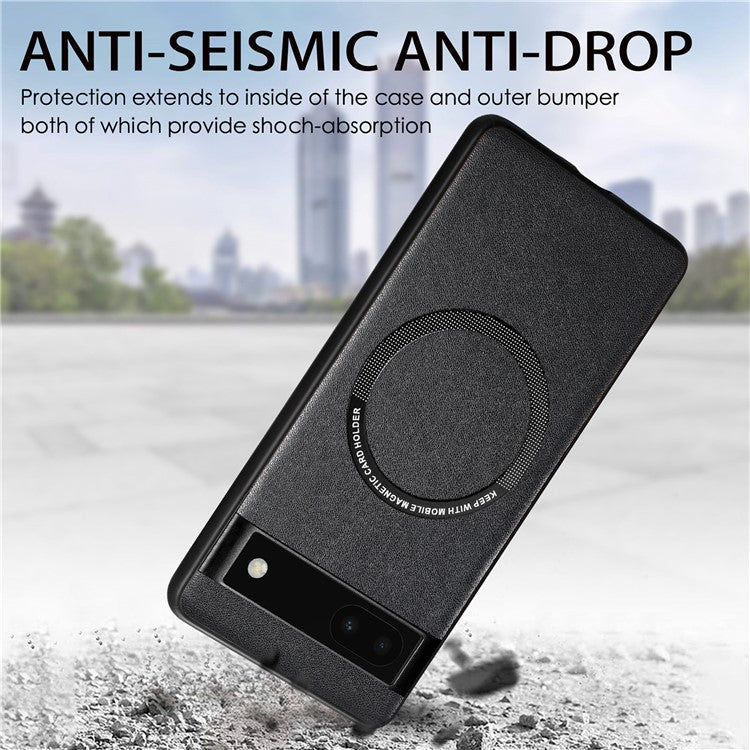 For Google Pixel 6a Drop-proof Phone Case Compatible with MagSafe PU Leather Coated PC+TPU Phone Cover - Black