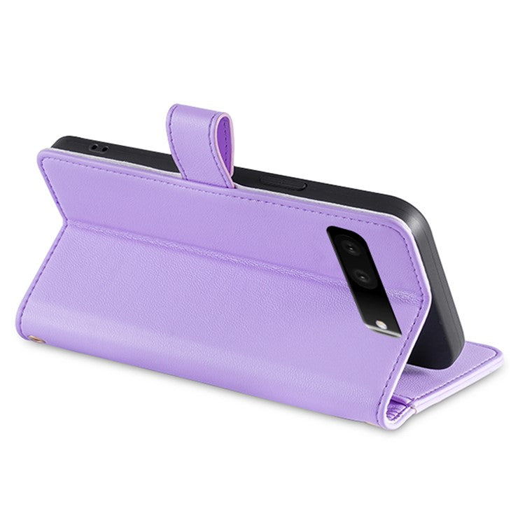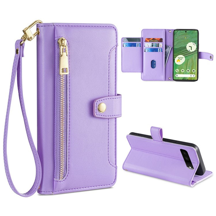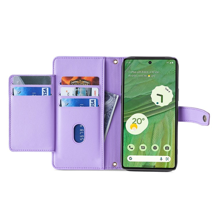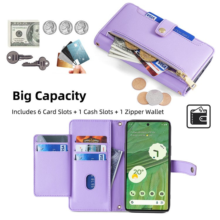 For Google Pixel 7 5G Textured PU Leather Zipper Pocket Wallet Phone Case Stand Multiple Card Slots Magnetic Closure Cover with Wrist Strap and Shoulder Strap - Purple