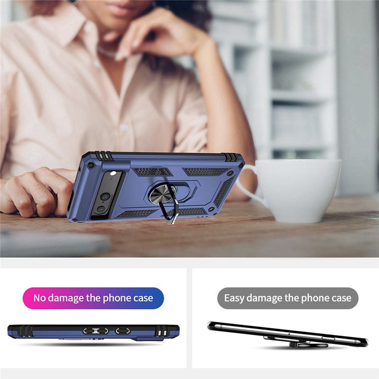 For Google Pixel 7 Military Grade Shockproof Anti-scratch Ring Kickstand PC + TPU Hybrid Phone Case Protector - Blue