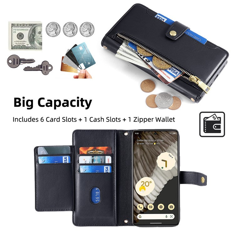 For Google Pixel 7 Pro 5G Textured PU Leather Zipper Pocket Flip Folio Case Multiple Card Slots Wallet Stand Wallet Phone Cover with Wrist Strap and Shoulder Strap - Black