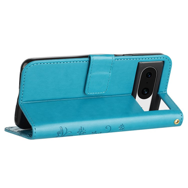 For Google Pixel 8 Phone Case Leather Flip Cover Butterfly Flower Pattern Imprinted - Blue
