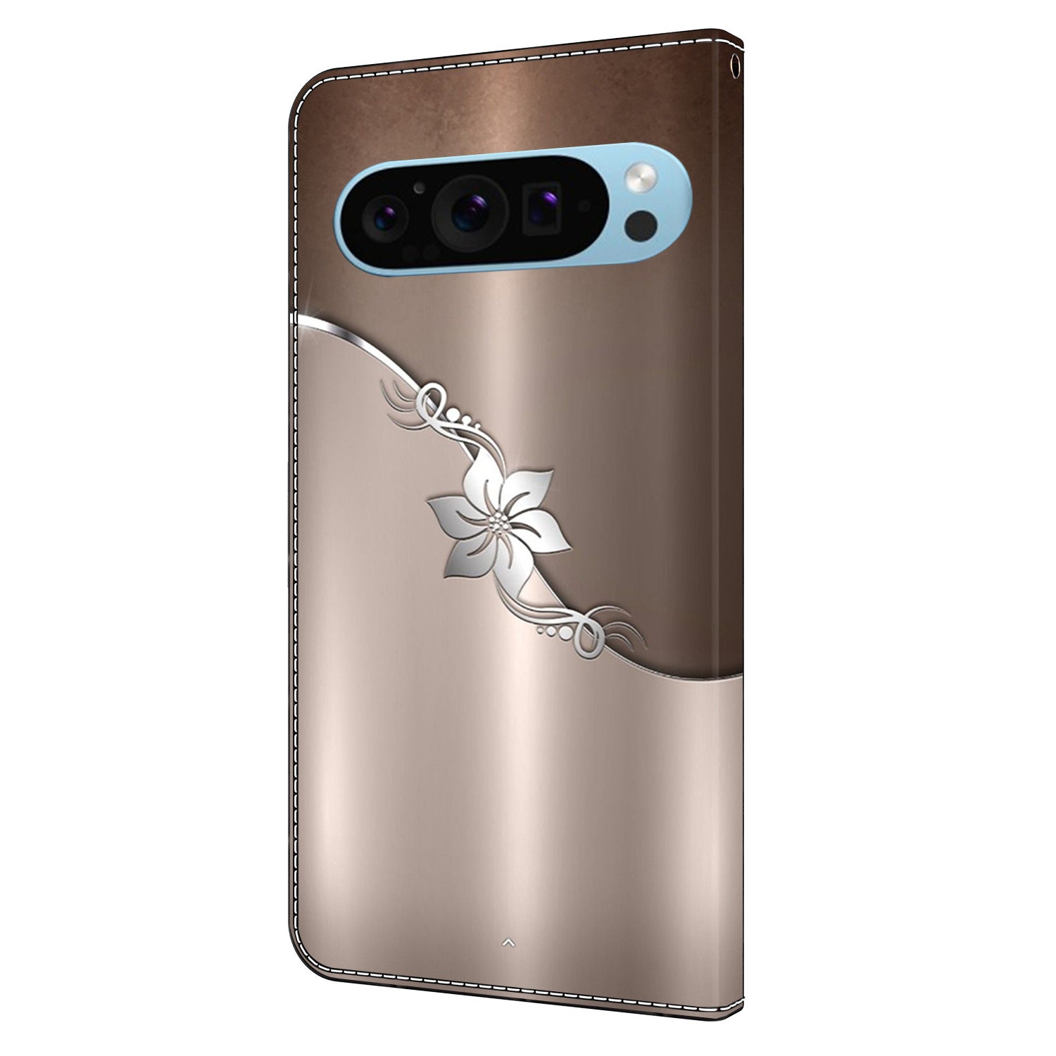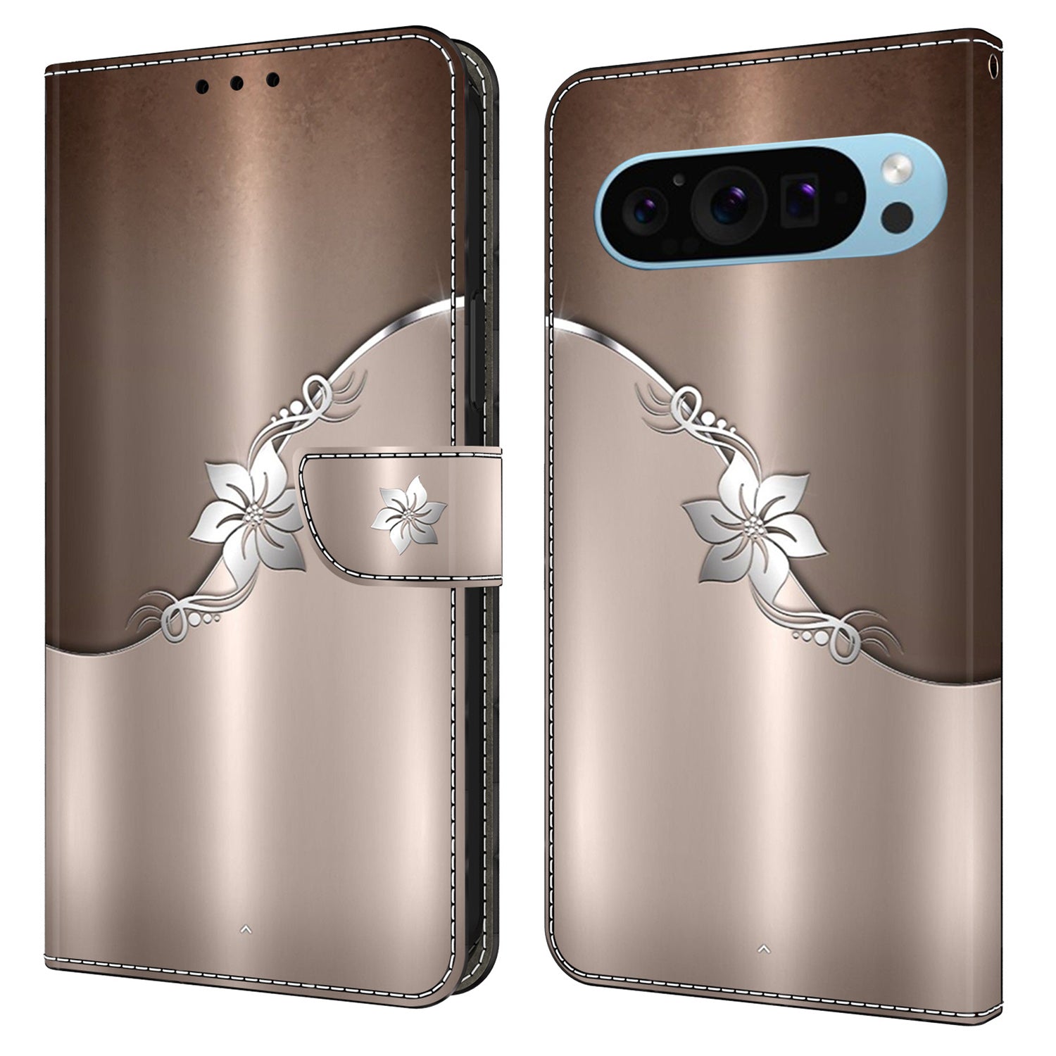 For Google Pixel 9 Case PU Leather 3D Pattern Wallet Phone Cover with Magnetic Clasp - Silver Flower
