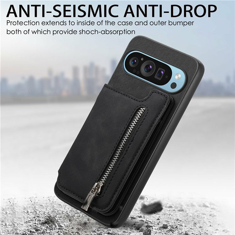 For Google Pixel 9 / Pixel 9 Pro Case Magnetic Detachable Zipper Card Holder Leather+TPU Phone Cover - Black