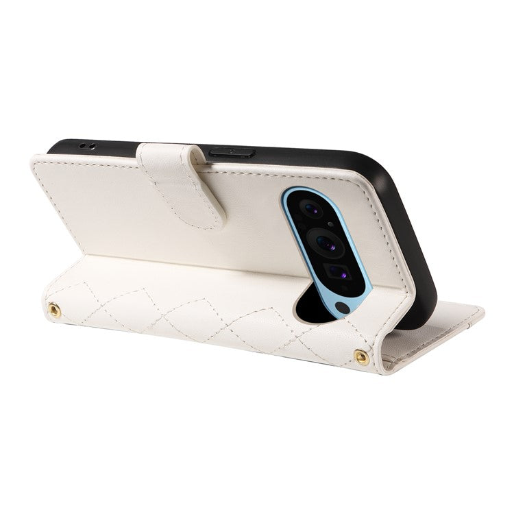 For Google Pixel 9 / Pixel 9 Pro Case Wallet Rhombus Leather Phone Cover with Shoulder Strap, Wrist Strap - White