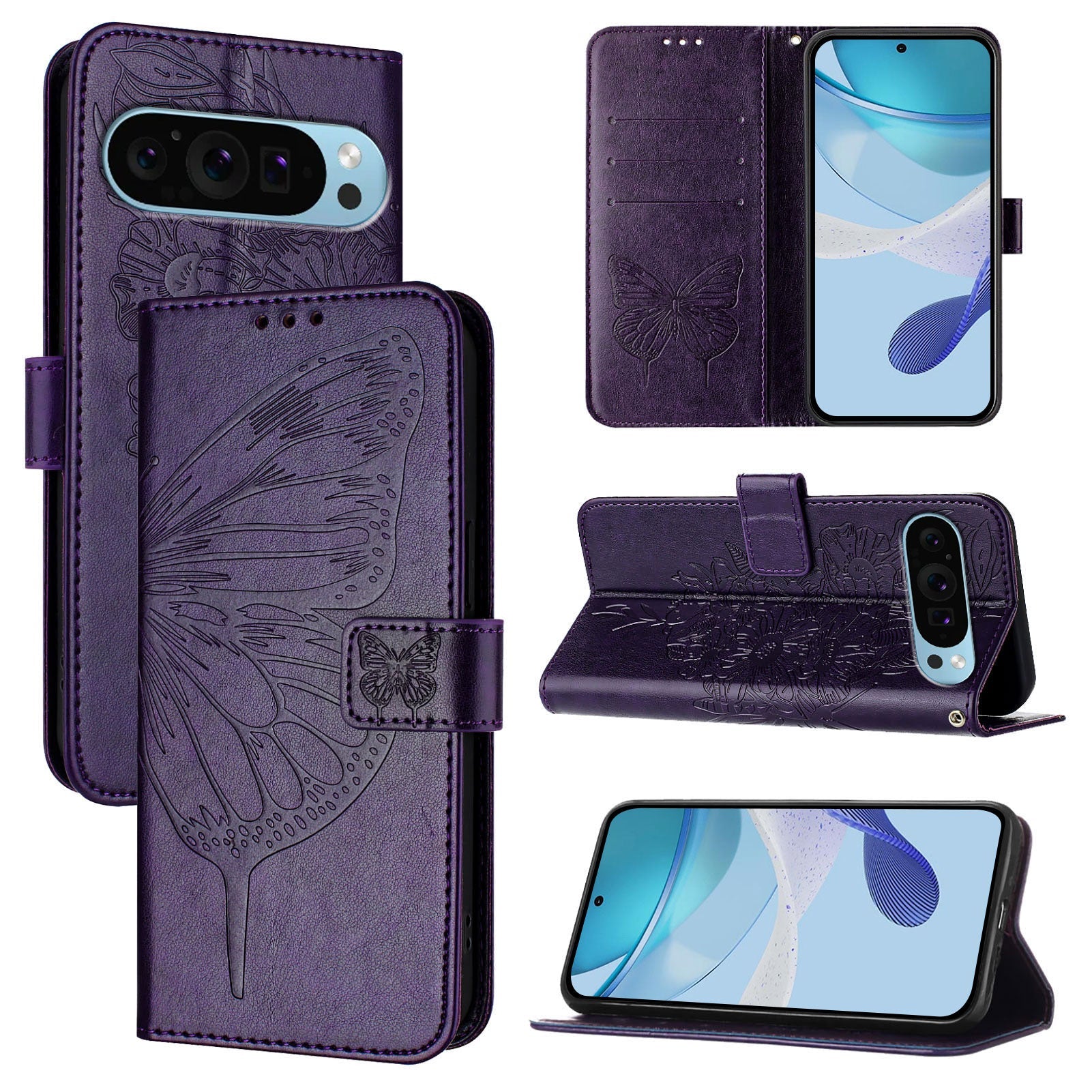 For Google Pixel 9 Pro / Google Pixel 9 Case YB Imprinting Series-4 Butterfly Flower Flip Wallet Leather Phone Cover - Dark Purple