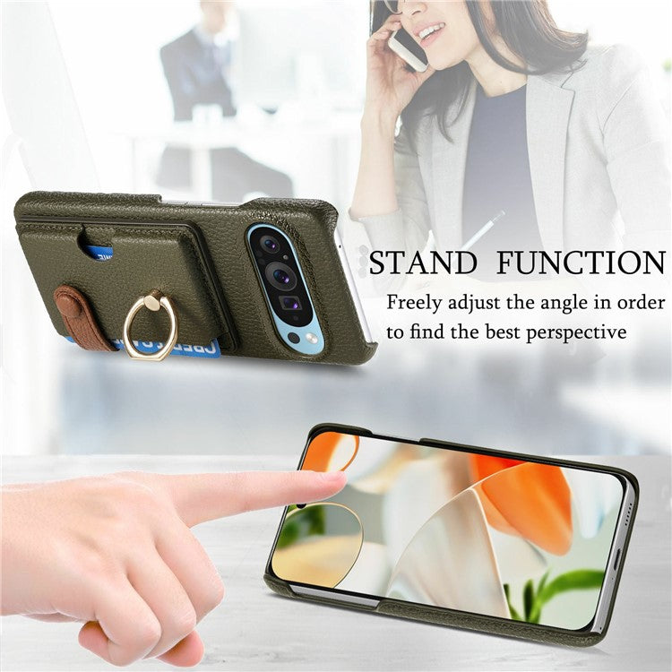 For Google Pixel 9 Pro XL Case Ring Holder Kickstand Card Slot Leather Phone Back Cover - Green