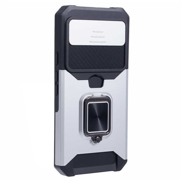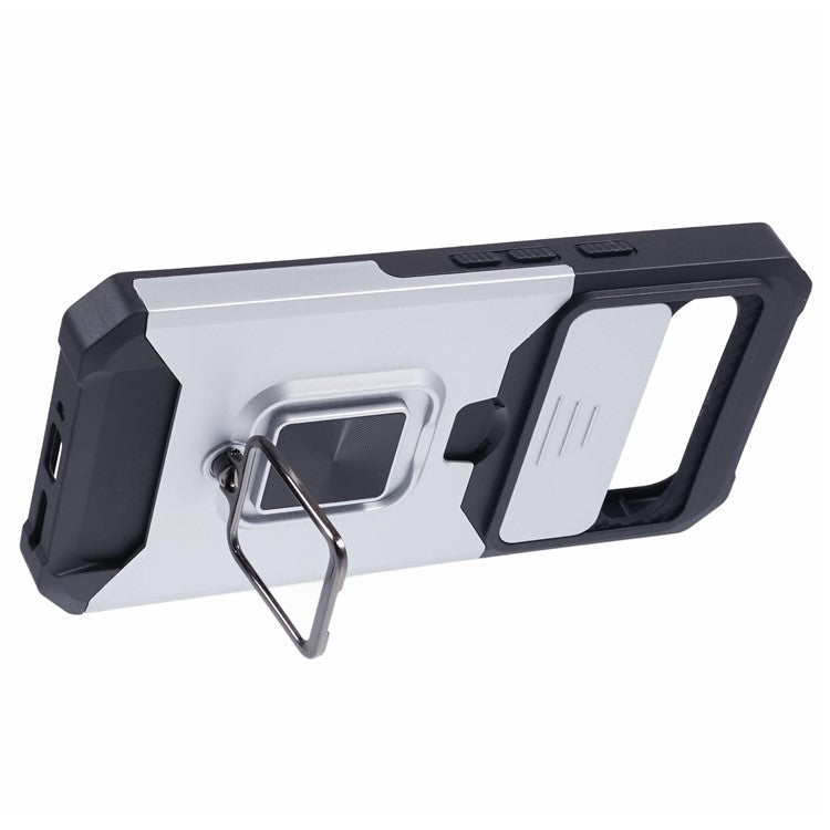 For Google Pixel 9 Pro XL Kickstand Case Slide Lens Lid PC+TPU Phone Cover with Card Holder - Silver