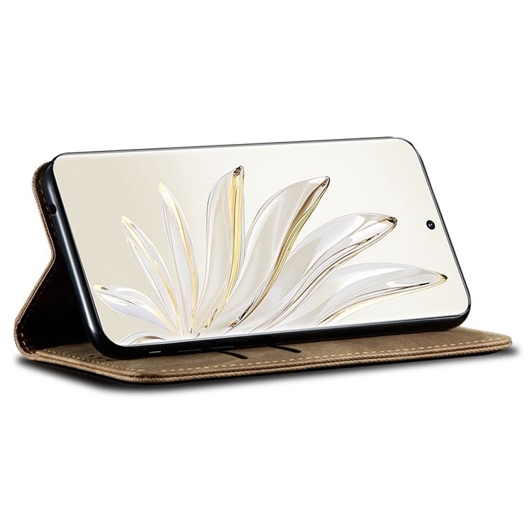 For Honor 70 5G Shockproof Phone Case Jeans Cloth Texture PU Leather Auto Magnetic Closed Flip Wallet Stand Cover - Khaki