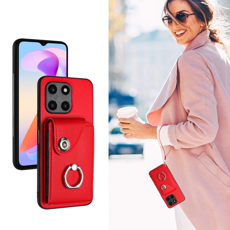 For Honor X6a Global Organ Card Bag Ring Holder PU Phone Case with Lanyard(Red)