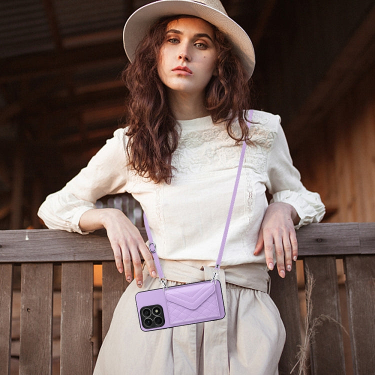 For Honor X8a Rhombic Texture Card Bag RFID Phone Case with Long Lanyard(Light Purple)