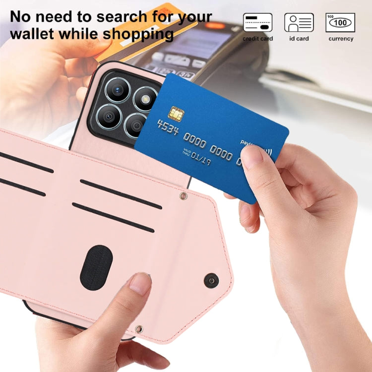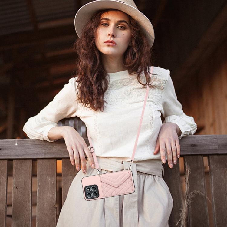 For Honor X8b 4G Global Rhombic Texture Card Bag RFID Phone Case with Long Lanyard(Rose Gold)