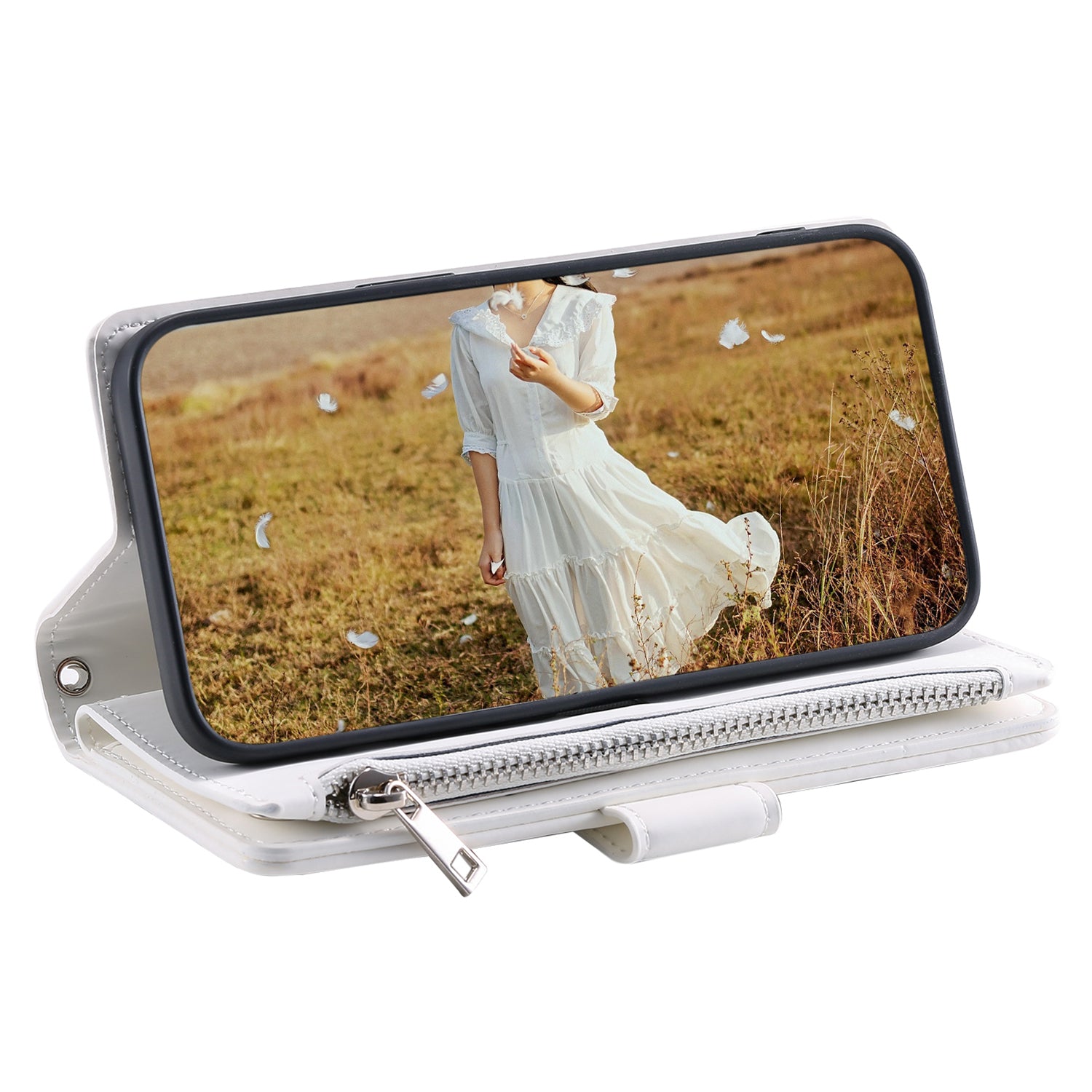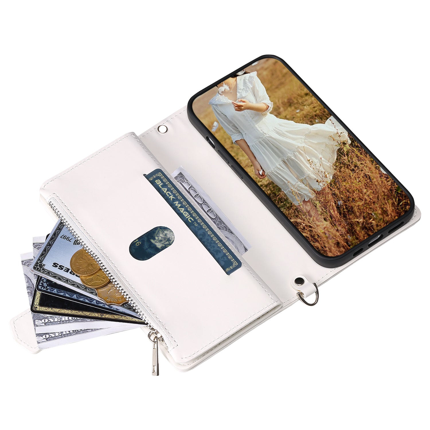 Uniqkart for iPhone 15 Anti-Dust PU Leather Phone Case Rhombus Texture Zipper Wallet Cover with Strap - White